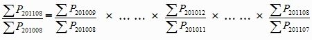 2、同比價格指數(shù)的計算方法。鑒于網(wǎng)簽數(shù)據(jù)從2010年12月份起開始上報,前11個月的網(wǎng)簽數(shù)據(jù)缺失,故不能計算今年1-11月份各月與網(wǎng)簽數(shù)據(jù)同一口徑的同比價格指數(shù)。為保持同比價格指數(shù)計算和發(fā)布的連續(xù)性和穩(wěn)定性,滿足有關方面的需要,國家統(tǒng)計局采用2010年的有關房價統(tǒng)計數(shù)據(jù)和2011年按網(wǎng)簽數(shù)據(jù)計算的房價數(shù)據(jù),根據(jù)同比指數(shù)和環(huán)比指數(shù)之間的數(shù)學關系,對8月份同比價格指數(shù)的計算進行了技術處理:將2010年9-12月份(4個月)的環(huán)比數(shù)據(jù)連乘,再乘以2011年前8個月的環(huán)比數(shù)據(jù)生成本月同比價格指數(shù)。以此類推可計算其他月份的同比價格指數(shù)。計算公式表示為: