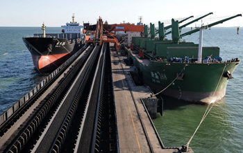 兩艘輪船靠泊在秦皇島港煤炭碼頭裝貨。記者