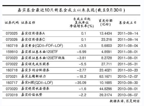 嘉實的十只新基金覆蓋了普通股票型、被動指數(shù)型基金、混合債基金以及QDII四種類型。來自巨靈的數(shù)據(jù)顯示,損失最慘重的是嘉實H股基金,截至9月29日,該基金自成立以來虧損了35.09%。