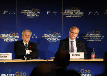 10月15日,在法國巴黎,歐洲中央銀行行長特里謝(左)和歐盟負責經(jīng)濟和貨幣事務委員奧利·雷恩在二十國集團(G20)財長和央行行長會議后參加新聞發(fā)布會。新華社記者