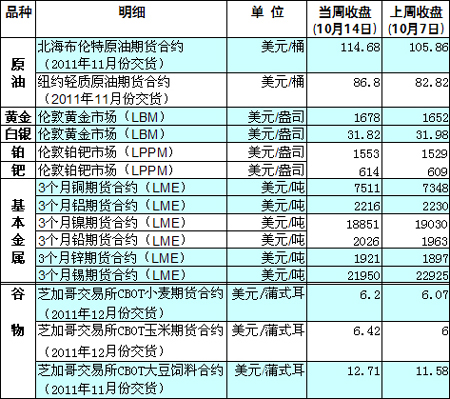 當(dāng)周?chē)?guó)際金價(jià)獲得支撐,金價(jià)累計(jì)上漲2.9%。另外,投資者對(duì)歐元信心的增強(qiáng)導(dǎo)致美元走弱,而弱勢(shì)美元也有利于支撐貴金屬等大宗商品市場(chǎng)。芝加哥農(nóng)產(chǎn)品期貨價(jià)格當(dāng)周集體上揚(yáng)。據(jù)美國(guó)農(nóng)業(yè)部14日公布的出口報(bào)告,美國(guó)在截至10月6日一周共出口玉米134.4萬(wàn)噸,高于此前市場(chǎng)預(yù)期,也是近5周以來(lái)第三周出口量超過(guò)100萬(wàn)噸。同時(shí),當(dāng)周美國(guó)出口小麥50萬(wàn)噸,同樣高于此前分析師的預(yù)測(cè)。除以上因素外,大豆期貨價(jià)格還受到能源價(jià)格大漲的影響而實(shí)現(xiàn)連續(xù)上行。