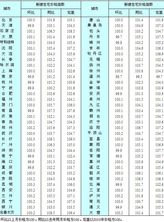3、2011年9月份,68個(gè)城市的新建住宅價(jià)格指數(shù)根據(jù)網(wǎng)簽數(shù)據(jù)計(jì)算,其他2個(gè)城市根據(jù)統(tǒng)計(jì)系統(tǒng)房地產(chǎn)開(kāi)發(fā)統(tǒng)計(jì)報(bào)表中各個(gè)項(xiàng)目的分類銷售面積和金額數(shù)據(jù)計(jì)算。68個(gè)網(wǎng)簽數(shù)據(jù)城市分別是:北京、天津、石家莊、太原、呼和浩特、沈陽(yáng)、大連、長(zhǎng)春、哈爾濱、上海、南京、杭州、寧波、合肥、福州、廈門、南昌、濟(jì)南、青島、鄭州、武漢、長(zhǎng)沙、廣州、深圳、南寧、?、重慶、成都、貴陽(yáng)、昆明、西安、蘭州、西寧、銀川、烏魯木齊、唐山、秦皇島、包頭、丹東、吉林、牡丹江、無(wú)錫、揚(yáng)州、徐州、溫州、金華、蚌埠、安慶、泉州、九江、贛州、煙臺(tái)、濟(jì)寧、洛陽(yáng)、平頂山、宜昌、襄陽(yáng)、岳陽(yáng)、常德、惠州、湛江、韶關(guān)、桂林、北海、三亞、瀘州、南充、大理。9月份新增加的城市是唐山、贛州、大理。