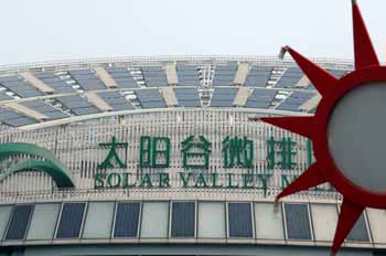 當你走近中國太陽谷時,首先遠遠映入眼簾的就是高大的太陽能圖騰矩陣。上頭是風(fēng)電裝置和太陽能電池板,中間是太陽能LED顯示時間,而基座上則是世界各地有關(guān)太陽能文化的浮雕,極具世界文化風(fēng)采。