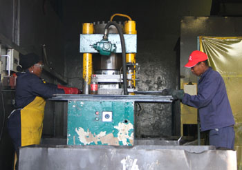 9月26日下午,記者來到約翰內(nèi)斯堡市區(qū)以北約25公里的萊澤工業(yè)園,約有上百家中小企業(yè)設(shè)在此處。萊澤金屬鍛壓公司就位于該園區(qū)。這是一家主要從事礦山輔助設(shè)備和民用鐵絲防護網(wǎng)制造的中型企業(yè),員工110人,其中100人為一線工人。