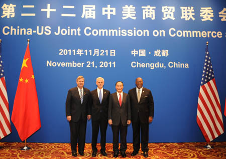 中國和美國21日在成都簽署了涉及知識產(chǎn)權(quán)、高技術(shù)、貿(mào)易統(tǒng)計、能源、企業(yè)合作對接等5個經(jīng)貿(mào)合作文件。第22屆中美商貿(mào)聯(lián)委會會議當日于此間舉行,國務(wù)院副總理王岐山與美國商務(wù)部長布賴森、貿(mào)易代表柯克共同主持會議,美國農(nóng)業(yè)部長維爾薩克與會。會議后,雙方舉行了有關(guān)協(xié)議的簽字儀式。 圖為參加會議的中美雙方代表在會前合影。