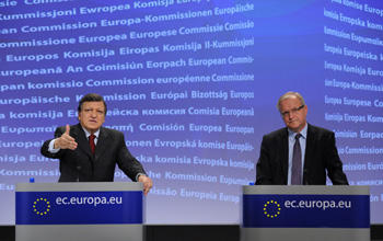 11月23日,在位于比利時(shí)首都布魯塞爾的歐盟總部,歐盟委員會(huì)主席巴羅佐(左)與歐盟委員會(huì)負(fù)責(zé)經(jīng)濟(jì)與貨幣事務(wù)的委員雷恩(右)出席聯(lián)合新聞發(fā)布會(huì)。法新社 |