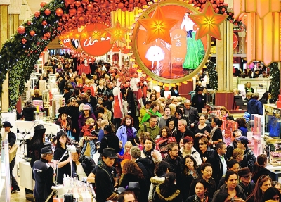 商家通常會(huì)在“黑色星期五”當(dāng)天凌晨開(kāi)門(mén)營(yíng)業(yè),不少消費(fèi)者會(huì)通宵達(dá)旦地排隊(duì)搶購(gòu)數(shù)量有限的特價(jià)商品。圖為11月25日上午,美國(guó)紐約梅西百貨公司內(nèi)人潮涌動(dòng)。