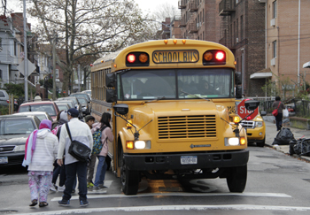 一輛享有特權(quán)的美國校車清晨在美國紐約皇后區(qū)一街道上接送學生。記者 王成云
