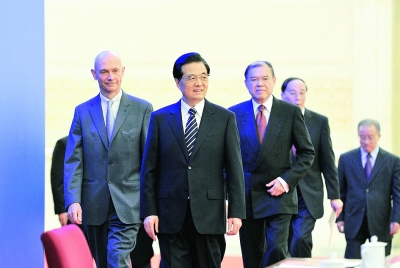 圖為國(guó)家主席胡錦濤同中外嘉賓一起步入會(huì)場(chǎng)。