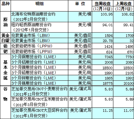 國際大宗商品期貨價格明細(xì)表[2011-12-19]