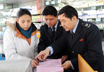 近日,河北省邢臺(tái)市在開(kāi)展對(duì)醫(yī)藥零售企業(yè)的專項(xiàng)整治中,充分利用醫(yī)?ㄖЦ缎畔⒈葘(duì),對(duì)納稅人開(kāi)展調(diào)查核實(shí)和納稅評(píng)估,合理確定醫(yī)?ㄖЦ督痤~占全部銷售收入的比例,有效規(guī)范了醫(yī)藥批發(fā)零售企業(yè)稅收秩序。圖為邢臺(tái)市橋西區(qū)國(guó)稅局評(píng)估人員在一家藥店通過(guò)收費(fèi)系統(tǒng)核對(duì)醫(yī)保卡支付信息和申報(bào)等數(shù)據(jù)。