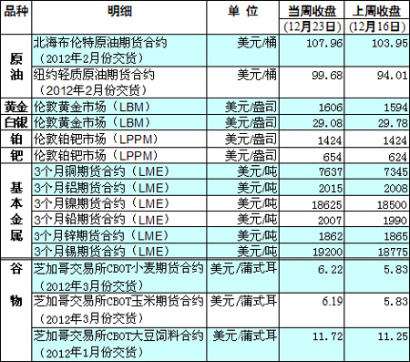 國際大宗商品期貨價(jià)格明細(xì)表[2011-12-26]