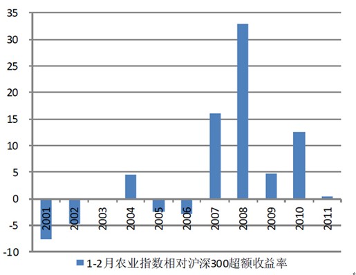 圖1:2001年至2011年1-2 月農(nóng)業(yè)指數(shù)相對(duì)滬深300 超額收益率