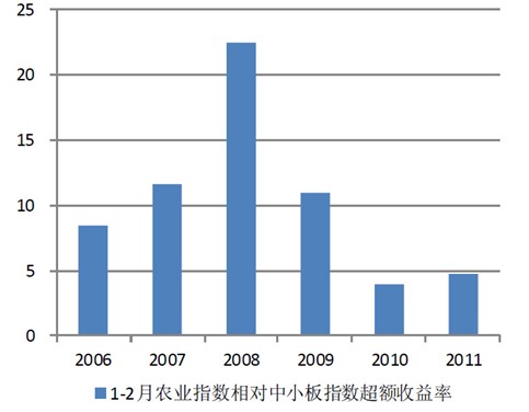 圖2:2001年至2011年1-2 月農(nóng)業(yè)指數(shù)相對(duì)中小板指數(shù)超額收益率