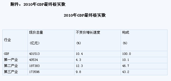 2010年GDP現(xiàn)價(jià)總量為401513億元,比初步核實(shí)數(shù)增加了311億元;按不變價(jià)格計(jì)算,比上年增長(zhǎng)10.4%,與初步核實(shí)數(shù)相同(詳見(jiàn)附件)。