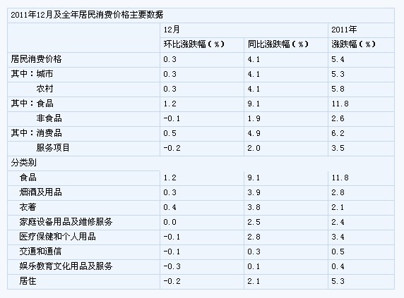 2011年12月份,全國居民消費價格總水平同比上漲4.1%。其中,城市上漲4.1%,農(nóng)村上漲4.1%;食品價格上漲9.1%,非食品價格上漲1.9%;消費品價格上漲4.9%,服務(wù)項目價格上漲2.0%。全國居民消費價格總水平環(huán)比上漲0.3%。其中,城市上漲0.3%,農(nóng)村上漲0.3%;食品價格上漲1.2%,非食品價格下降0.1%;消費品價格上漲0.5%,服務(wù)項目價格下降0.2%。2011年,全國居民消費價格總水平比上年上漲5.4%。
