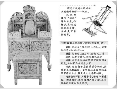 在百度貼吧和新浪微博,網(wǎng)民都在熱議“漢代的凳子”。 記者調(diào)查得知,關(guān)于這把“漢代凳子”,多家媒體曾正兒八經(jīng)地報(bào)道過:在北京中嘉國際拍賣有限公司舉辦的“2011年古代玉器專場(chǎng)拍賣會(huì)”上,“漢代青黃玉龍鳳紋化妝臺(tái)(含坐凳)”以1.8億元起拍,最終以2.2億元成交。 據(jù)悉,它創(chuàng)下新的玉器拍賣紀(jì)錄,同時(shí)它也是2011年中國藝術(shù)品拍賣市場(chǎng)的最貴玉器。 記者隨后登錄中嘉拍賣公司網(wǎng)站查詢,很快找到了關(guān)于這套拍品的記錄,與上述情況完全相符。 這套玉器,被拍賣公司說成是一套“讓今人看后嘆為觀止,具有極高的收藏和歷史價(jià)值”的文物珍品。但它被很多網(wǎng)民嘲笑為“作假不專業(yè)”:大家紛紛指出,按照一般的歷史常識(shí),漢代古人都是“席地而坐”的,當(dāng)時(shí)還沒發(fā)明凳子! 隨后,記者查詢了大量資料。按照通說,凳子的最初形態(tài)為西域的“胡床”,而后演變?yōu)榈首,隋唐時(shí)期逐漸盛行。 漢代古人皆習(xí)慣席地而坐。漢代時(shí)確有“胡床”傳入中原,但樣式與被拍賣的“天價(jià)玉凳”大相徑庭。