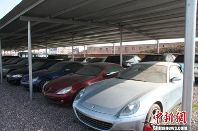 2月8日,記者在警方陪同下來到東陽市公安局停車場,見到了尚未拍賣的包括法拉利、奔馳、寶馬等11輛轎車,時(shí)隔多年,幾輛豪華小車上面都布滿灰塵,一些部位已經(jīng)生銹。