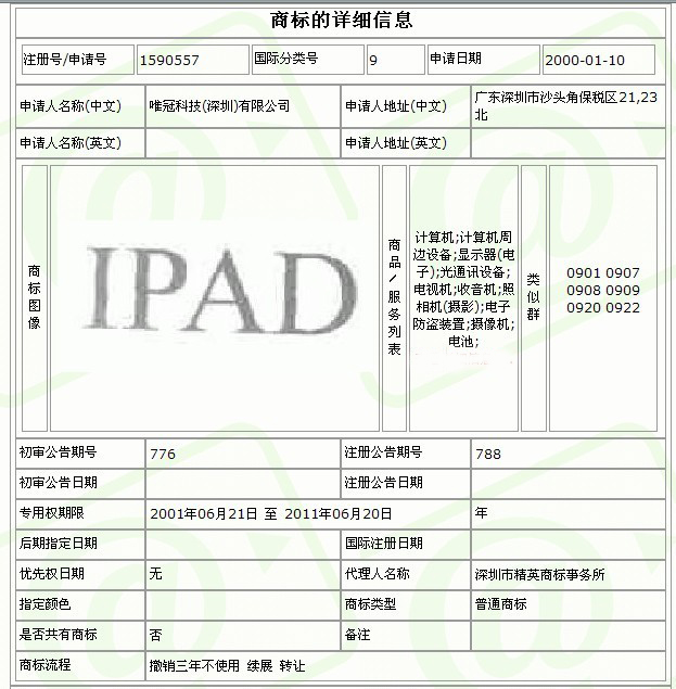 內(nèi)地注冊(cè)信息顯示 深圳唯冠在2000年就擁有了iPad注冊(cè)商標(biāo)