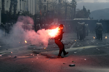 希臘議會13日凌晨以2/3多數(shù),通過了該國與歐盟和國際貨幣基金組織達成的關于第二輪救援貸款的協(xié)議。根據(jù)這一救援協(xié)議,希臘政府將實施新的緊縮措施。希臘民眾舉行了反對緊縮措施的示威活動。 圖為在希臘首都雅典市中心議會附近的示威活動中,示威者向防暴警察投擲煙霧彈。