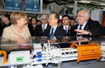 2月3日,正在廣東考察的國務(wù)院總理溫家寶與德國總理默克爾在廣州參觀海瑞克(廣州)隧道設(shè)備有限公司。記者 姚大偉 攝 |