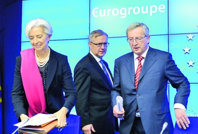 2月21日,在比利時(shí)首都布魯塞爾的歐盟總部,國(guó)際貨幣基金組織總裁拉加德、歐盟委員會(huì)負(fù)責(zé)經(jīng)濟(jì)與貨幣事務(wù)的委員雷恩和歐元集團(tuán)主席、盧森堡首相容克(左至右)出席歐元區(qū)財(cái)長(zhǎng)會(huì)議后的記者招待會(huì)。
