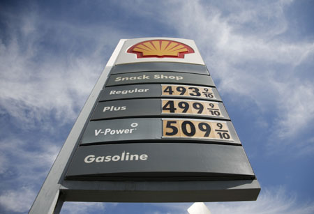 這是2月21日在美國洛杉磯一個加油站拍攝的油價顯示牌。 由于歐盟就救助希臘達(dá)成協(xié)議,市場情緒大大提振,國際油價21日大漲,紐約和倫敦兩地均創(chuàng)下9個月高點(diǎn)。到當(dāng)天收盤時,紐約商品交易所3月交貨的輕質(zhì)原油期貨價格大漲2.60美元,收于每桶105.84美元,漲幅為2.52%,為去年5月份以來的最高水平。倫敦市場4月交貨的北海布倫特原油期貨價格也大漲1.61美元,收于每桶121.66美元,漲幅為1.34%。