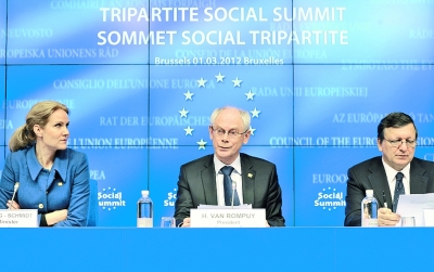 圖為歐洲理事會主席范龍佩、歐盟委員會主席巴羅佐以及歐盟輪值主席國丹麥?zhǔn)紫嗤袑帯な┟芴?月1日在布魯塞爾舉行的社會三方峰會后出席記者招待會,其隨后將出席歐盟峰會。