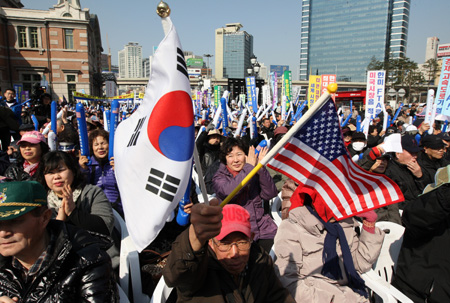 3月15日,韓國(guó)和美國(guó)自由貿(mào)易協(xié)定(FTA)正式生效,韓美兩國(guó)將分階段廢除所有商品關(guān)稅。韓國(guó)民眾對(duì)此事反應(yīng)不一,圖為部分民眾在首爾舉行慶祝集會(huì)。