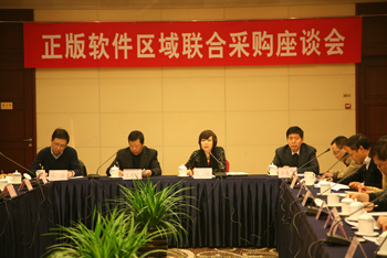 圖為財(cái)政國庫司政府采購辦公室主任王瑛(左三)、中央國家機(jī)關(guān)政府采購中心主任王力達(dá)(左二)在正版軟件區(qū)域聯(lián)合采購座談會上。資料照片 |