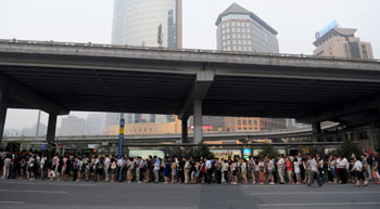 圖為一些北京CBD的上班族下班后在國貿橋下排隊等候回家的公共汽車。記者 羅曉光
