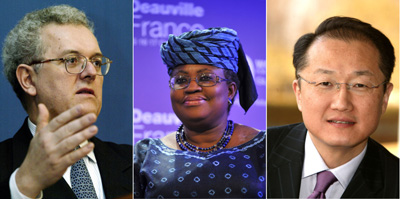 三位候選人分別是:韓裔美籍醫(yī)學(xué)專家、美國達特茅斯學(xué)院校長金辰勇,前世行常務(wù)副行長、尼日利亞財政部長奧孔喬·伊韋拉,前聯(lián)合國副秘書長、哥倫比亞前財政部長奧坎波。