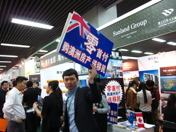 4月5日,為期四天的2012年北京春季房地產(chǎn)展示交易會(huì)在中國(guó)國(guó)際貿(mào)易中心開(kāi)幕。本屆房展會(huì)有美國(guó)、加拿大、澳大利亞、新加坡、英國(guó)、泰國(guó)等超過(guò)30個(gè)國(guó)家和地區(qū)的130多個(gè)海外地產(chǎn)商參加。數(shù)百個(gè)項(xiàng)目類型涵蓋了住宅、公寓、別墅、土地交易和投資移民等。圖為一家澳洲房產(chǎn)展臺(tái)工作人員打出“零首付、送移民”的廣告牌吸引看房客。記者