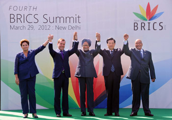 3月29日,金磚國家領導人第四次會晤在印度新德里舉行。這是胡錦濤主席同巴西總統(tǒng)羅塞夫、俄羅斯總統(tǒng)梅德韋杰夫、印度總理辛格、南非總統(tǒng)祖馬合影。記者