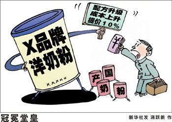 “一罐奶粉的成本不會超過100元,可是國內市場上‘洋奶粉’的零售價動輒三四百元,比境外貴一兩倍;還有一些打著‘洋奶粉’旗號的中國特供奶,價格也高得離譜,對消費者產(chǎn)生一定的誤導性!币晃粚<冶г梗把竽谭邸北├呀(jīng)到了讓人難以置信的地步,但消費者對其肆無忌憚的連續(xù)漲價卻束手無策。 《經(jīng)濟參考報》記者了解到,進口奶粉量價齊增,一方面是需求增加,另一方面則是行業(yè)的暴利驅使更多企業(yè)進口奶粉。值得關注的是,進口奶粉與國產(chǎn)奶粉的競爭正在向中低端延伸。以前,進口奶粉主攻高端市場,現(xiàn)在各種中小品牌和雜牌“洋奶粉”也蜂擁而至,向中低端市場挺進,直接蠶食傳統(tǒng)的國產(chǎn)奶粉市場。