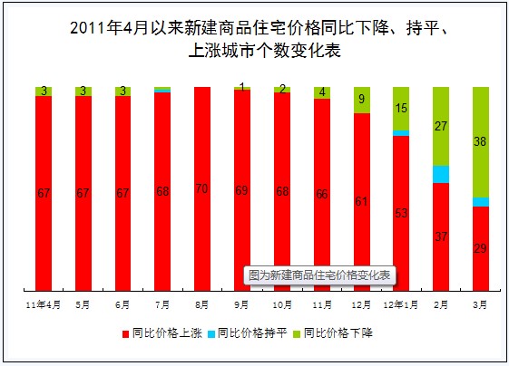 4月18日,國(guó)家統(tǒng)計(jì)局發(fā)布了3月份70個(gè)大中城市住宅銷售價(jià)格數(shù)據(jù)。數(shù)據(jù)顯示,70個(gè)大中城市新建商品住宅銷售價(jià)格總體上繼續(xù)呈下降態(tài)勢(shì)。 從同比數(shù)據(jù)看,3月份,70個(gè)大中城市新建商品住宅銷售價(jià)格同比下降的城市有38個(gè),比2月份增加了11個(gè),是自2011年9月個(gè)別城市再次出現(xiàn)價(jià)格同比下降以來(lái),下降城市個(gè)數(shù)最多的月份。