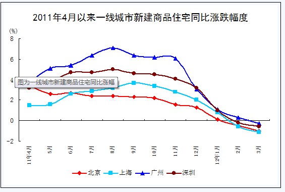 從環(huán)比數(shù)據(jù)看,3月份,70個(gè)大中城市新建商品住宅銷售價(jià)格環(huán)比下降的城市有46個(gè),比2月份增加了1個(gè)。北京、上海、廣州、深圳等一線城市新建商品住宅銷售價(jià)格環(huán)比連續(xù)6個(gè)月下降。東南沿海城市如杭州、寧波、溫州、金華、青島等新建商品住宅銷售價(jià)格環(huán)比降幅也進(jìn)一步擴(kuò)大,環(huán)比降幅分別為4.6%、1.7%、1.1%、4.6%和1.2%,降幅比2月份分別擴(kuò)大4.3個(gè)、1.6個(gè)、0.6個(gè)、4.5個(gè)和1.0個(gè)百分點(diǎn)。3月份,新建商品住宅銷售價(jià)格整體繼續(xù)走低,主要有兩方面的原因,一是開發(fā)商采取“以價(jià)換量”銷售策略較為普遍,二是部分商業(yè)銀行對(duì)首套房貸利率實(shí)施了優(yōu)惠措施。