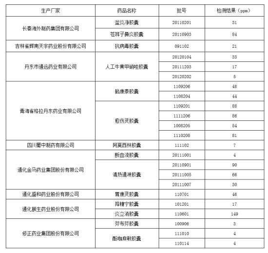 第一批檢驗(yàn)主要針對媒體曝光的9家藥品生產(chǎn)企業(yè),共抽驗(yàn)33個(gè)品種42個(gè)批次,其中23個(gè)批次不合格。檢驗(yàn)結(jié)果表明,長春海外制藥集團(tuán)有限公司、青海格拉丹東藥業(yè)有限公司、丹東市通遠(yuǎn)藥業(yè)有限公司、吉林省輝南天宇藥業(yè)股份有限公司、四川蜀中制藥有限公司、修正藥業(yè)集團(tuán)股份有限公司、通化金馬藥業(yè)集團(tuán)股份有限公司、通化盛和藥業(yè)股份有限公司、通化頤生藥業(yè)股份有限公司等企業(yè)有的批次產(chǎn)品使用的膠囊鉻含量超過國家藥典限量標(biāo)準(zhǔn)。上述企業(yè)未按藥品生產(chǎn)質(zhì)量管理規(guī)范組織生產(chǎn),使用了不符合國家藥典標(biāo)準(zhǔn)的膠囊,產(chǎn)品質(zhì)量不合格。
