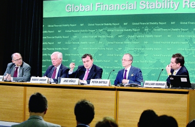 國(guó)際貨幣基金組織(IMF)當(dāng)?shù)貢r(shí)間4月18日在美國(guó)首都華盛頓發(fā)布《全球金融穩(wěn)定報(bào)告》。報(bào)告指出,盡管近期的一系列救助措施緩解了歐元區(qū)金融的動(dòng)蕩局勢(shì),但歐元區(qū)的債務(wù)和銀行體系危機(jī)依然對(duì)全球金融穩(wěn)定構(gòu)成威脅。 圖為IMF貨幣與資本市場(chǎng)部主任何塞·比尼亞爾斯(左三)在《全球金融穩(wěn)定報(bào)告》發(fā)布會(huì)上講話。