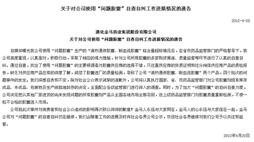 此外通化金馬藥業(yè)集團(tuán)股份有限公司在其網(wǎng)站上公布的“關(guān)于對公司使用‘問題膠囊’自查自糾工作進(jìn)展情況的通告”中使用了大量帶有褒揚(yáng)性質(zhì)的詞匯介紹其工作進(jìn)展!巴ǜ妗敝刑岬剑骸白悦襟w曝光我公司使用‘問題膠囊’生產(chǎn)的‘清熱通淋膠囊、斷血流膠囊’鉻含量超標(biāo)情況后,在省市藥品監(jiān)管部門的嚴(yán)格督導(dǎo)下,我公司高度重視,認(rèn)真面對,積極行動,采取了相應(yīng)的得力措施,針對公司所用膠囊的多家購貨渠道、質(zhì)量監(jiān)督等環(huán)節(jié)進(jìn)行了認(rèn)真的自查自糾”。