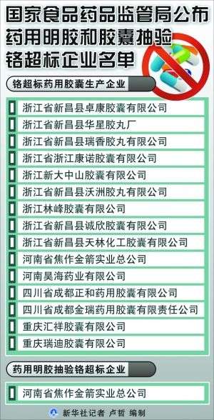 據(jù)國家食品藥品監(jiān)督管理局網(wǎng)站消息,按照企業(yè)全覆蓋、品種全覆蓋、產(chǎn)品批次隨機抽樣的原則,國家食品藥品監(jiān)管局在全國范圍內(nèi)對藥用明膠和膠囊生產(chǎn)企業(yè)進行了全面排查,對18家藥用明膠生產(chǎn)企業(yè)抽驗了166批明膠,檢出1批產(chǎn)品鉻超標(biāo);對117家藥用膠囊生產(chǎn)企業(yè)抽驗了941批藥用膠囊,檢出15家企業(yè)74批膠囊鉻超標(biāo),不合格率為7.9%。