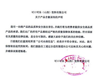 被當(dāng)合格品出售》,報道指出,可口可樂(山西)飲料公司員工向記者爆料,因管道改造,致使消毒用的含氯處理水混入公司9個批次價值約500萬元左右的12萬箱可樂產(chǎn)品中,目前部分產(chǎn)品已被當(dāng)作合格產(chǎn)品銷往市場。隨后,山西省質(zhì)監(jiān)部門介入調(diào)查。