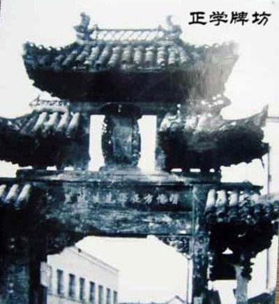 上個世紀(jì)60年代的寧?h城街道。圖中牌坊為紀(jì)念明代大儒方孝孺而建的正學(xué)牌坊(毀于文革)。