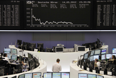 由于希臘新政府組閣失敗,有關(guān)該國是否會退出歐元區(qū)的擔(dān)憂重壓市場。全球股市14日多數(shù)下跌,中國香港股市恒生指數(shù)下跌229.59點,收于19735.04點,跌幅為1.15%。歐美股市開盤大跌,截至發(fā)稿時,英國、法國、德國主要股指跌幅均超過2%,美國三大股指跌幅也接近1%。 圖為德國法蘭克福證券交易所。