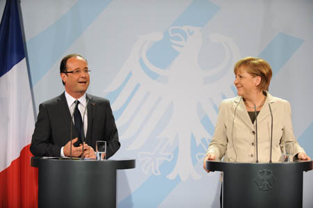5月15日,德國總理默克爾(右)與來訪的法國新任總統(tǒng)奧朗德在柏林一同出席新聞發(fā)布會。 德國總理默克爾15日在柏林總理府與當天剛剛就任法國總統(tǒng)的奧朗德舉行首次會晤。雙方承諾將合作克服分歧,尋找推動歐洲增長之路,同時表示希望希臘留在歐元區(qū),并將為此提供幫助。