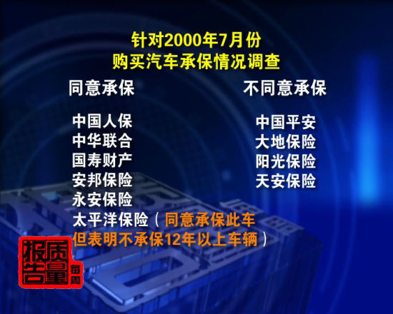 事實(shí)真的如此嗎?記者在江蘇對(duì)2011年我國財(cái)產(chǎn)險(xiǎn)公司中,業(yè)務(wù)收入排名前十位的保險(xiǎn)公司進(jìn)行了調(diào)查。結(jié)果,針對(duì)這輛2000年7月購買的小汽車,五家保險(xiǎn)公司同意對(duì)承保車損險(xiǎn),其中包括中國人保,中華聯(lián)合,國壽財(cái)產(chǎn),安邦保險(xiǎn)和永安保險(xiǎn)。太平洋保險(xiǎn)表示可對(duì)此車承保,但不承保車齡在12年以上的車輛。其余四家保險(xiǎn)公司不同意承保,包括中國平安,大地保險(xiǎn),陽光保險(xiǎn)和天安保險(xiǎn)。