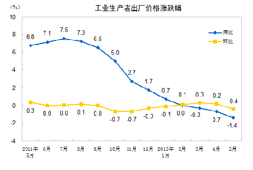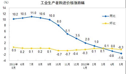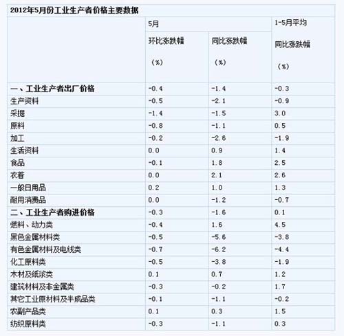 2012年5月份,全國(guó)工業(yè)生產(chǎn)者出廠價(jià)格同比下降1.4%,環(huán)比下降0.4%。工業(yè)生產(chǎn)者購進(jìn)價(jià)格同比下降1.6%,環(huán)比下降0.3%。1—5月平均,工業(yè)生產(chǎn)者出廠價(jià)格同比下降0.3%,工業(yè)生產(chǎn)者購進(jìn)價(jià)格同比上漲0.1%。