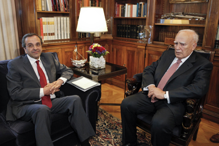 圖為希臘總統(tǒng)帕普利亞斯會見新民主黨領(lǐng)導人薩馬拉斯(左)。