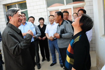5月9日,在甘肅省定西市安定區(qū)太平村,新華社社長李從軍采訪養(yǎng)雞專業(yè)戶陳云花(前右)。說到高興處,陳云花開懷大笑。 5月8日至11日,新華社社長李從軍帶領調研小組到甘肅定西、臨洮等地就三西扶貧30年進行采訪調研。新華社記者