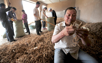 甘肅省定西市臨洮縣洮陽鎮(zhèn)陽屲村黨支部書記瓦廣吉(右一)在村里的中藥材庫房內查看藥材品質。新華社記者 張錳